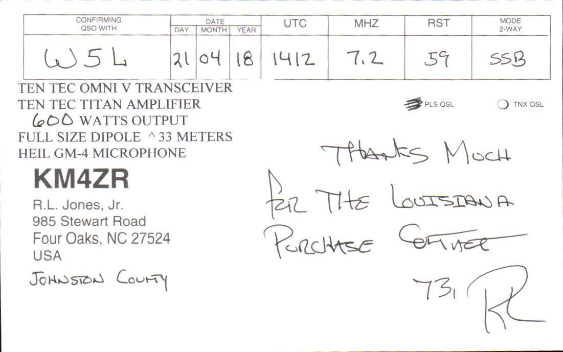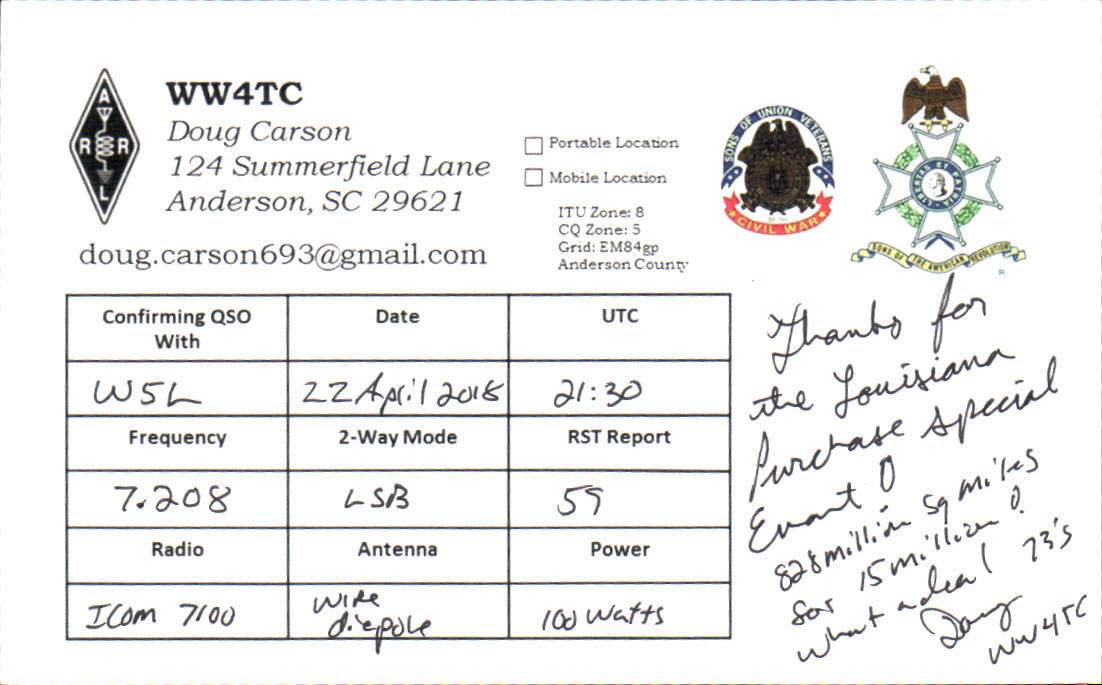 Louisiana Purchase Special Event Received QSL Cards From the 2022 event: W5L 2018 Call District 4 1 2 3 ► From the 2020 event: From the 2019 event: From the 2018 event: