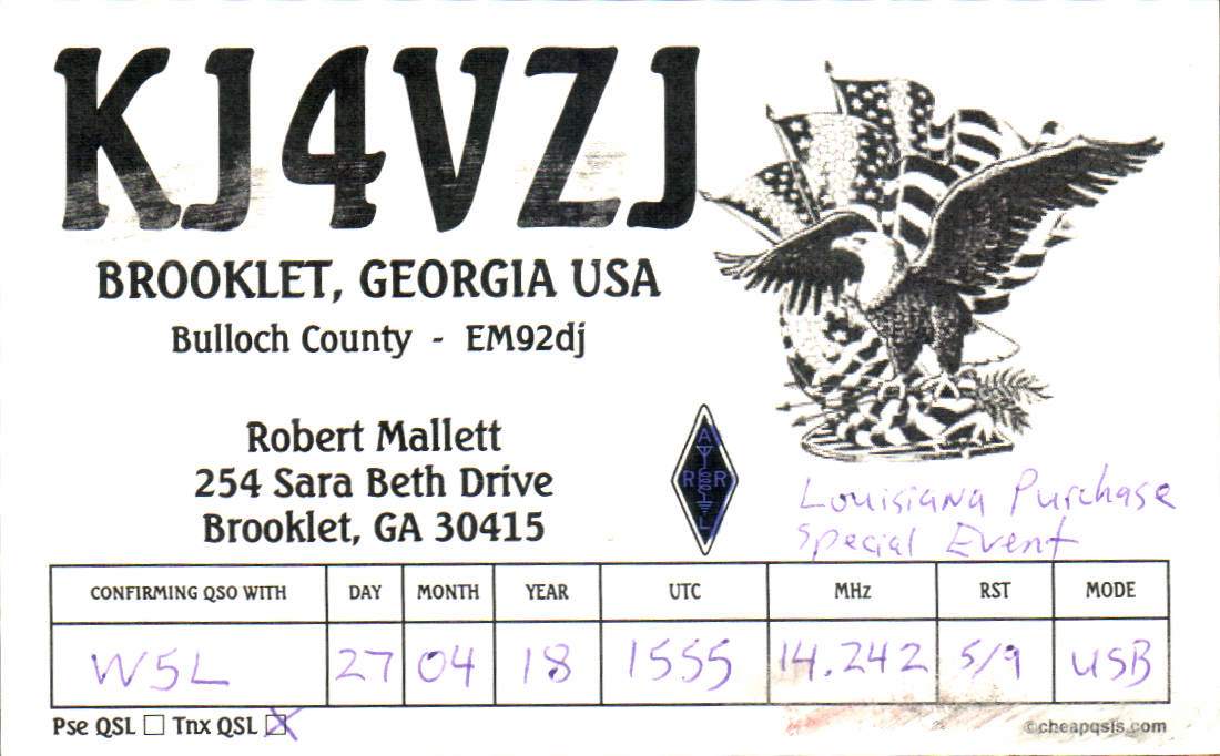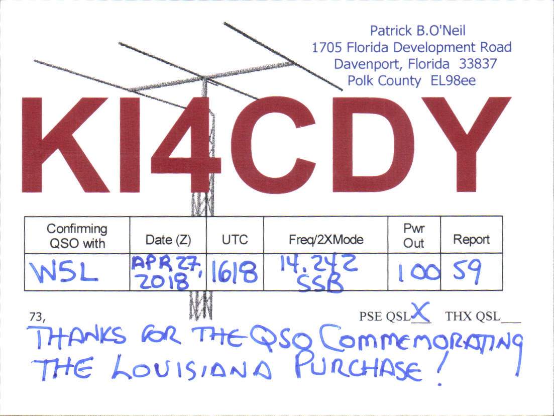 Louisiana Purchase Special Event Received QSL Cards From the 2022 event: W5L 2018 Call District 4 ◄ 1 2 3 From the 2020 event: From the 2019 event: From the 2018 event: