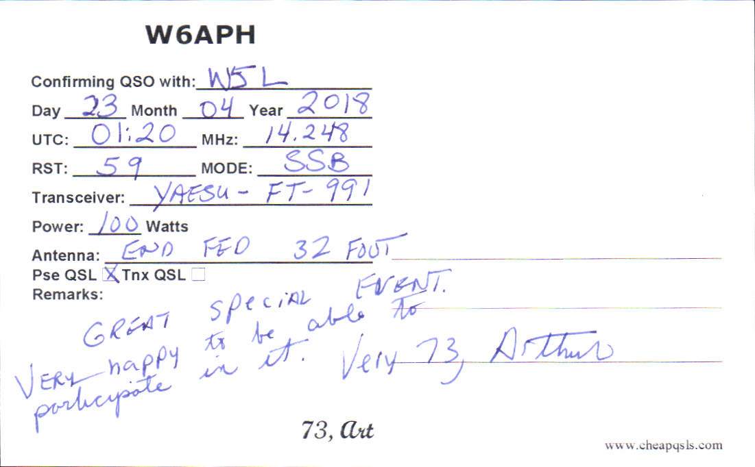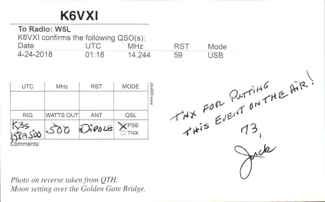 Louisiana Purchase Special Event Received QSL Cards From the 2022 event: W5L 2018 Call District 6 ◄ 1 2 From the 2020 event: From the 2019 event: From the 2018 event: