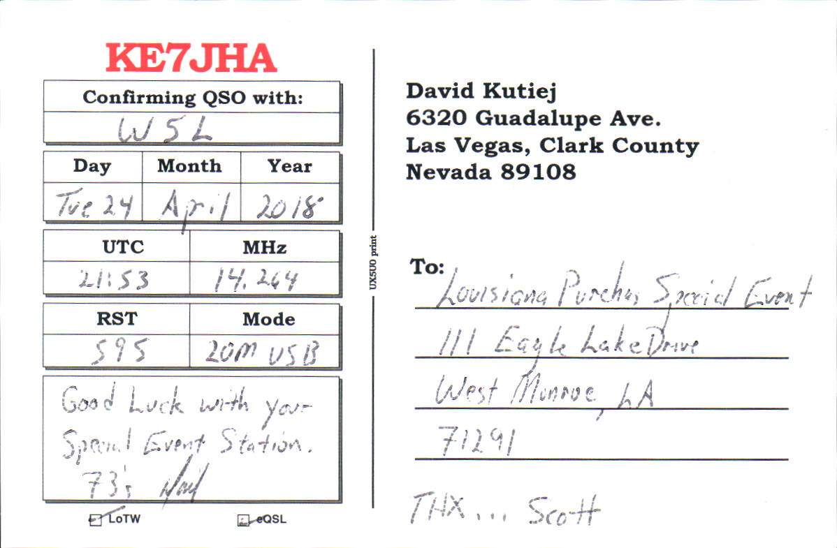 Louisiana Purchase Special Event Received QSL Cards From the 2022 event: W5L 2018 Call District 7 ◄ 1 2 From the 2020 event: From the 2019 event: From the 2018 event: