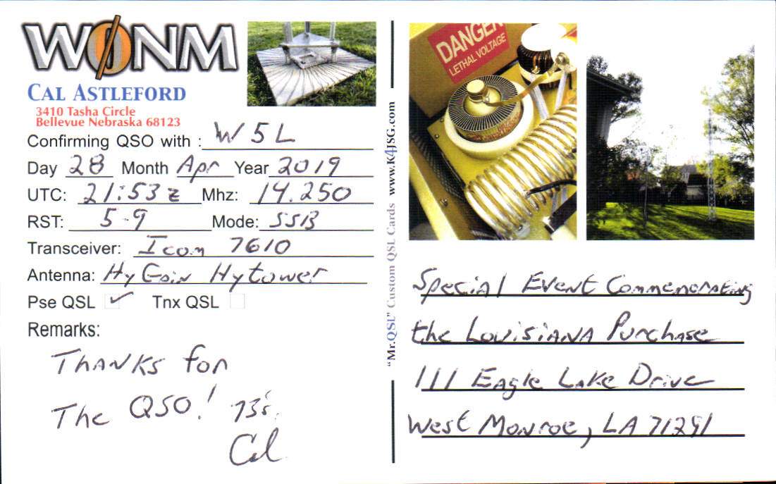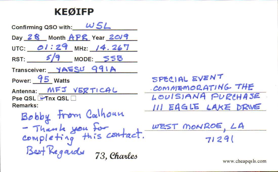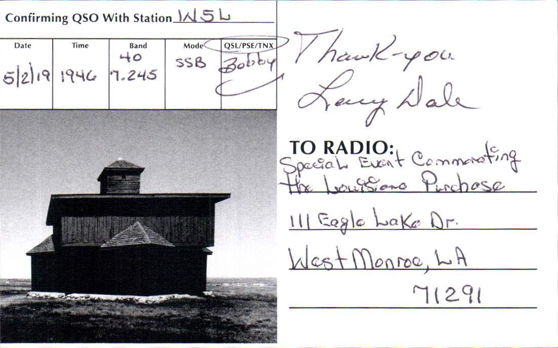 Louisiana Purchase Special Event Received QSL Cards From the 2022 event: W5L 2019 Call District 0 ◄ 1 2 3 ► From the 2020 event: From the 2019 event: From the 2018 event: