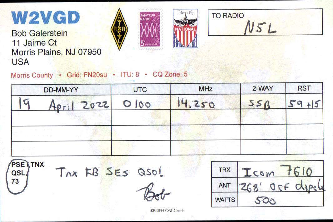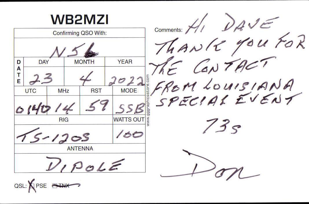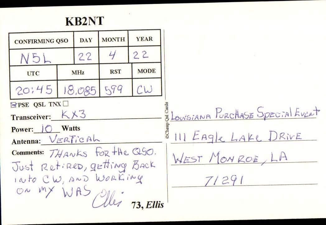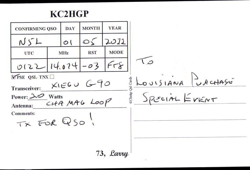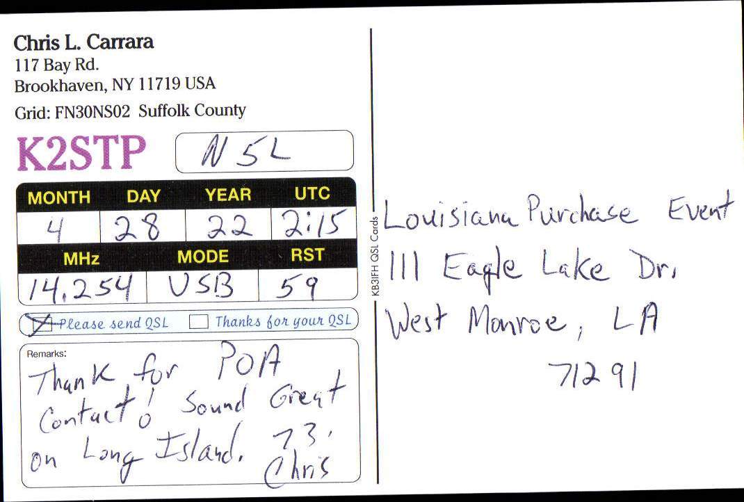 Louisiana Purchase Special Event Received QSL Cards From the 2022 event: N5L 2022 Rcvd QSLs » N5L 2022 CALL DISTRICT 2 1 2 ► From the 2020 event: From the 2019 event: From the 2018 event: