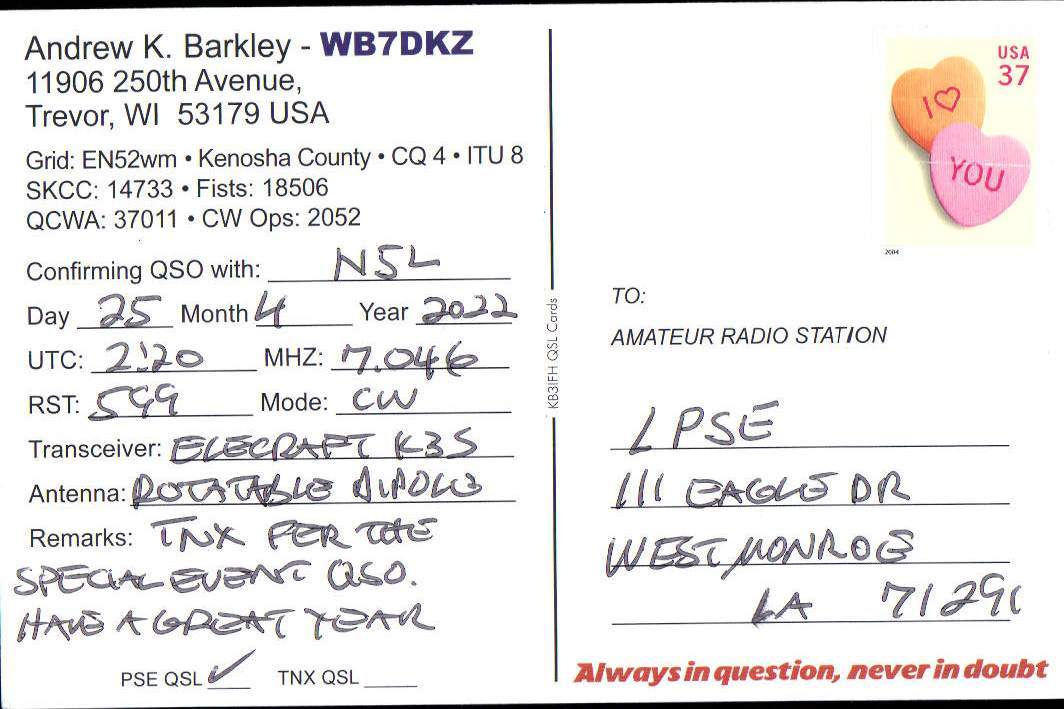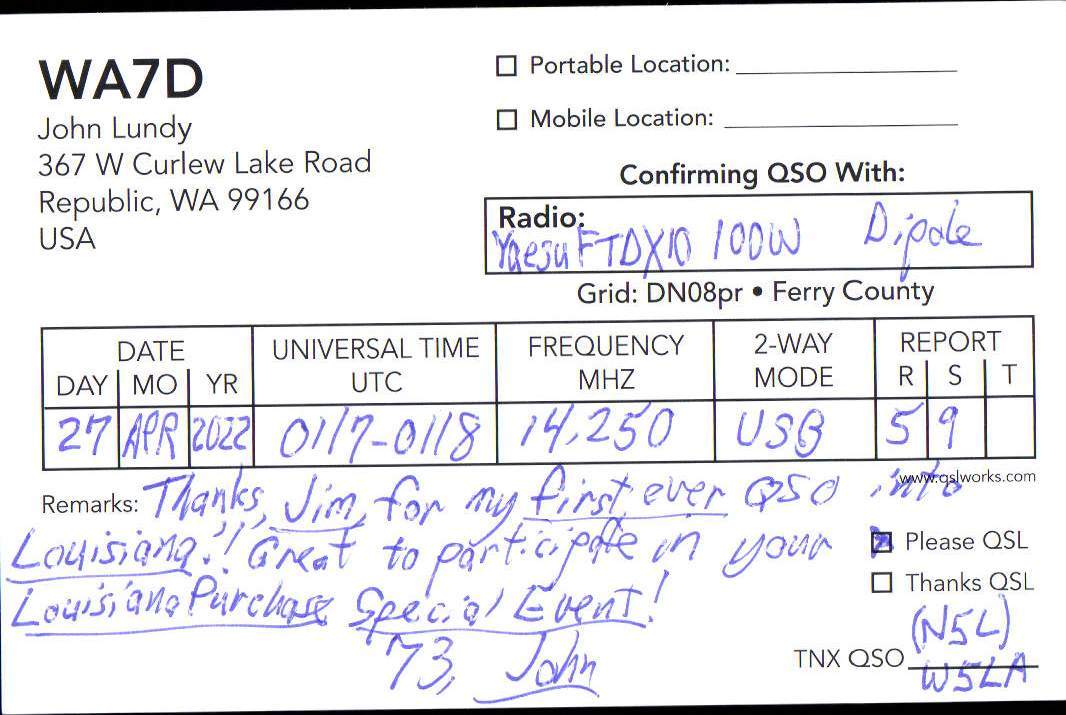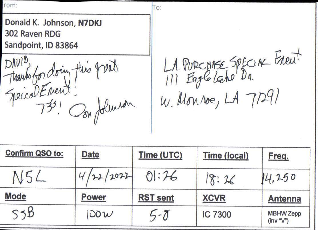 Louisiana Purchase Special Event Received QSL Cards From the 2022 event: N5L 2022 Rcvd QSLs » N5L 2022 CALL DISTRICT 7 1 2 ► From the 2020 event: From the 2019 event: From the 2018 event: