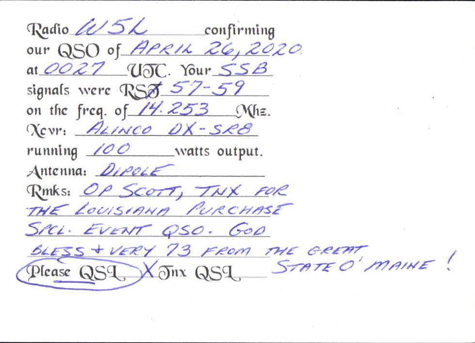 Louisiana Purchase Special Event Received QSL Cards From the 2022 event: W5L 2020 Call District 1 1 2 3 ► From the 2020 event: From the 2019 event: From the 2018 event: