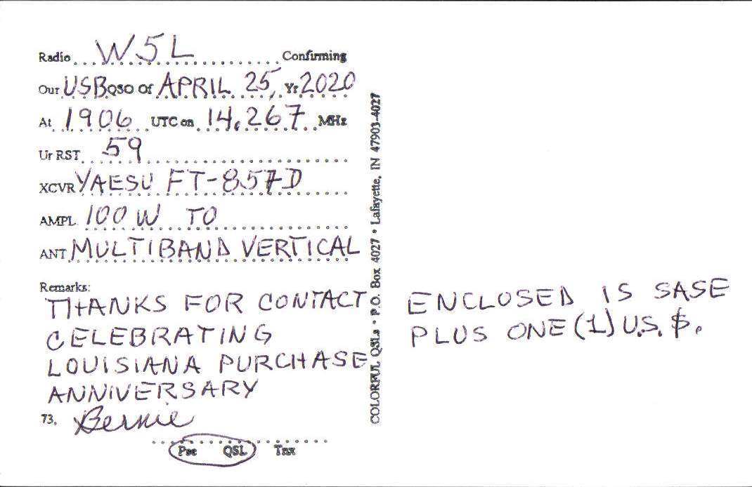 Louisiana Purchase Special Event Received QSL Cards From the 2022 event: W5L 2020 Call District 9 ◄ 1 2 3 ► From the 2020 event: From the 2019 event: From the 2018 event: