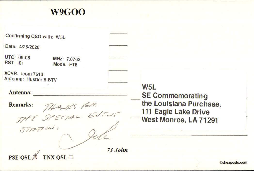 Louisiana Purchase Special Event Received QSL Cards From the 2022 event: W5L 2020 Call District 9 ◄ 1 2 3 From the 2020 event: From the 2019 event: From the 2018 event: